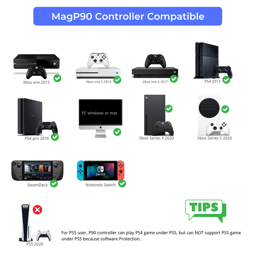 – 2025 Latest Update For Xbox Series X/S user, P90 controller can work on Series X/S well. For PS5 user, P90 controller can play PS4 game under PS5, but can NOT support PS5 game under PS5 because software Protection.